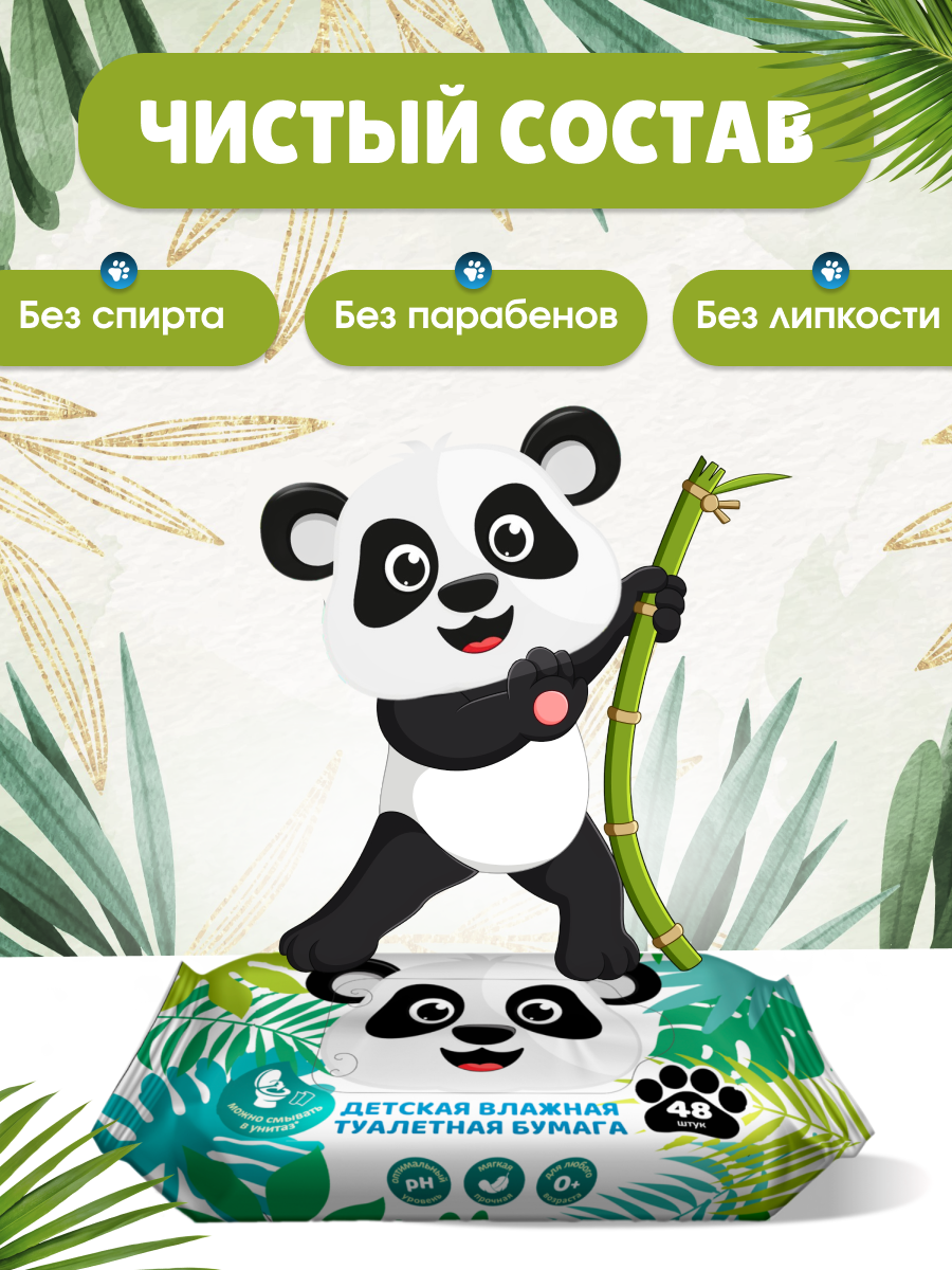 Детская влажная туалетная бумага 0+ «Панда» — гипоаллергенная, смываемая, без спирта, для новорожденных
