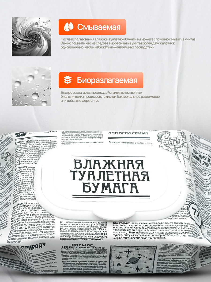 Отдельного внимания заслуживает оригинальный дизайн упаковки: на ней размещены интересные факты и полезная информация, что делает использование продукта не только комфортным, но и приятным.