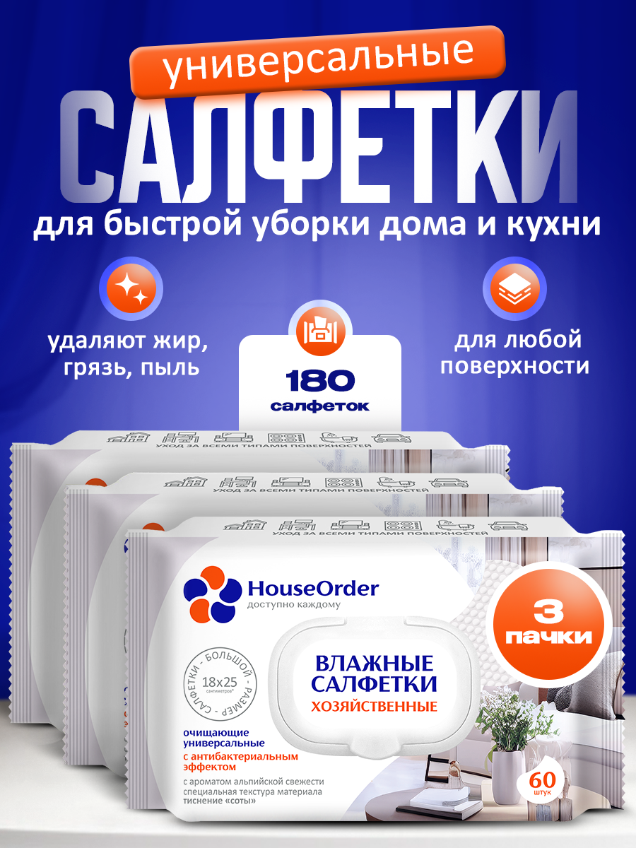 Влажные салфетки для уборки HouseOrder — это удобное и эффективное решение для поддержания чистоты в доме без лишних усилий. Они идеально подходят для быстрого удаления пыли, жира и загрязнений с различных поверхностей: кухонных столешниц, бытовой техники, мебели и сантехники.